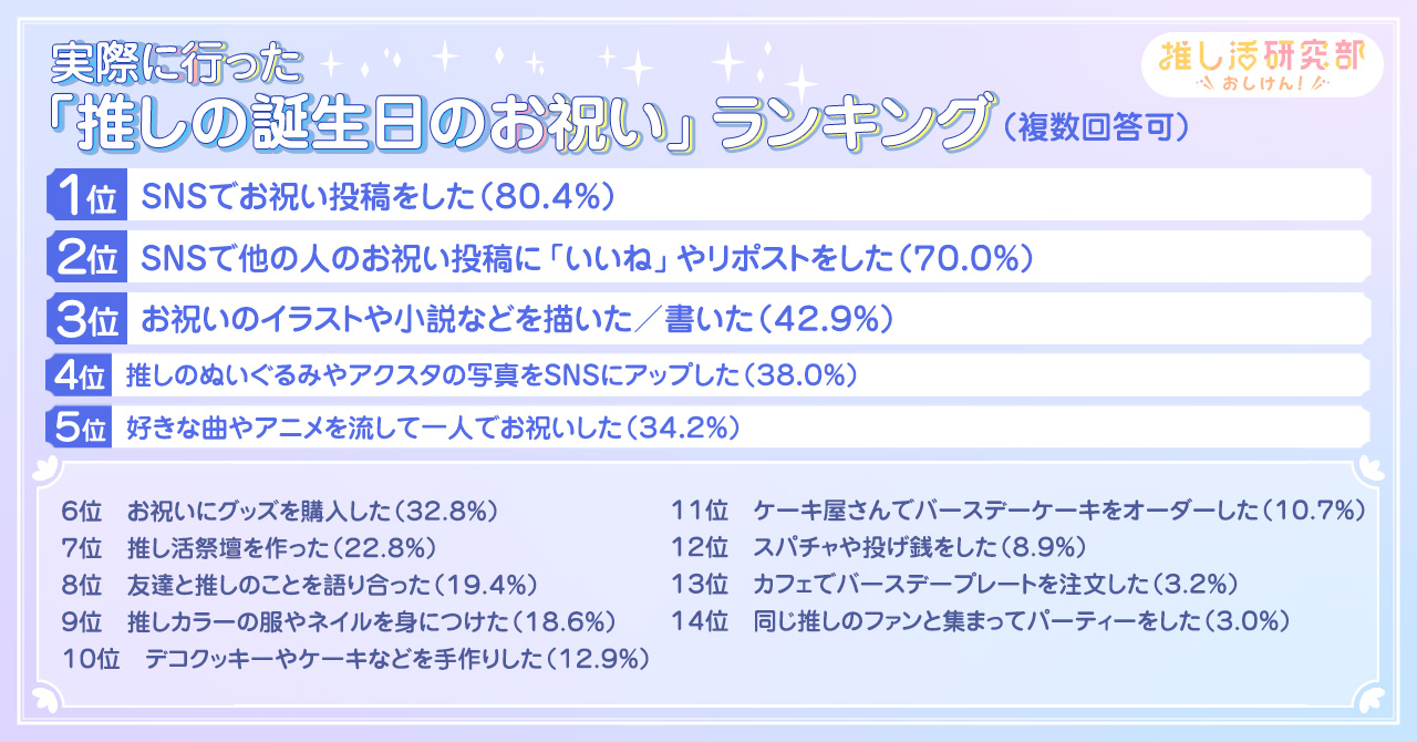 多くのユーザーが推しの誕生日を大切にし、積極的にお祝いしていることが分かります。さらに、どのようなお祝いをしているのかについても詳しく調査しました。