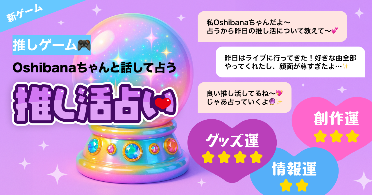 「Oshibanaちゃん」と推し活についてお話しすると、推し活に関する運勢を教えてくれる推し活占い。グッズ運、情報運、創作運など、あなたに合わせた推し活運勢に寄り添って占ってくれます。