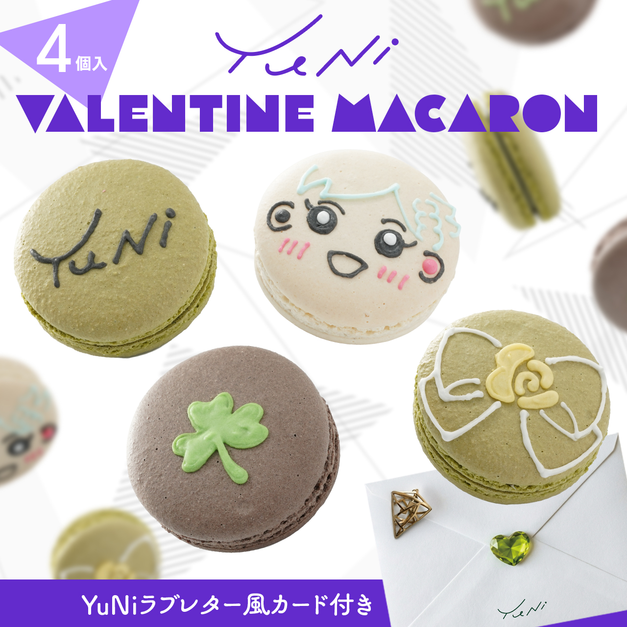 『YuNi』のバレンタインに関するオリジナル動画を、マカロンと一緒にお送りします。同封されたカードに記載されているQRコードから、ダウンロードしてお楽しみください。