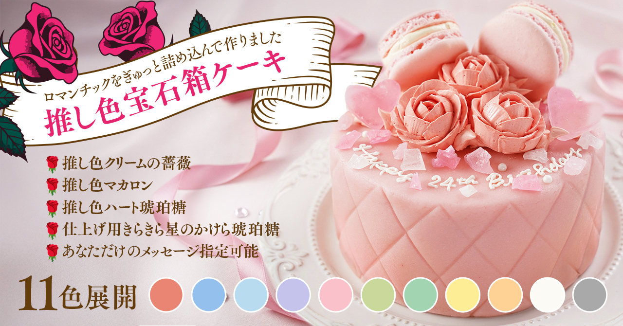 さらに、それぞれの推し色に合わせた「きらきら星のかけら琥珀糖」がついていますので、メッセージや薔薇の周りなどに自由に散りばめ、あなただけの宝石箱ケーキを完成させてください。